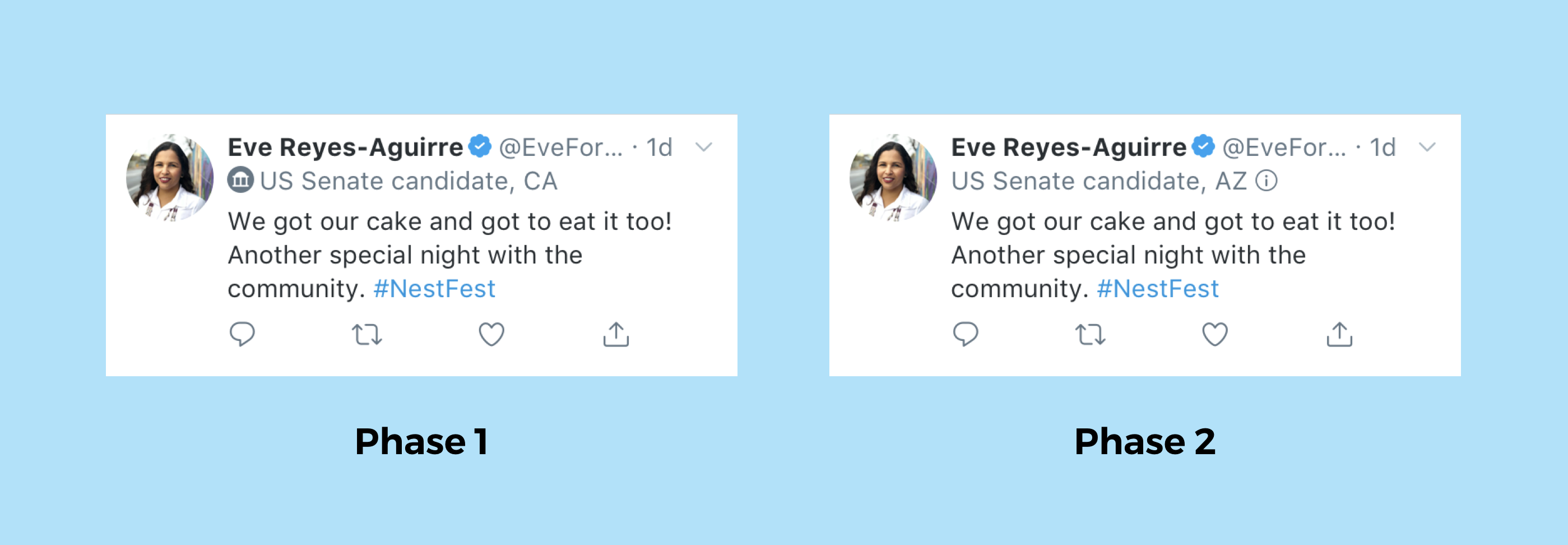 The solution had to be impossible to fake within Tweets and profile spaces. Many people try to fake Verification badges by adding blue circular emoji (i.e., š, šµ, or š·) to their display names. This requirement quickly eliminated any idea involving a badge or insignia placed around the profile picture. The winning solution was a text-based label and icon placed prominently on each candidateās Tweets and profile.