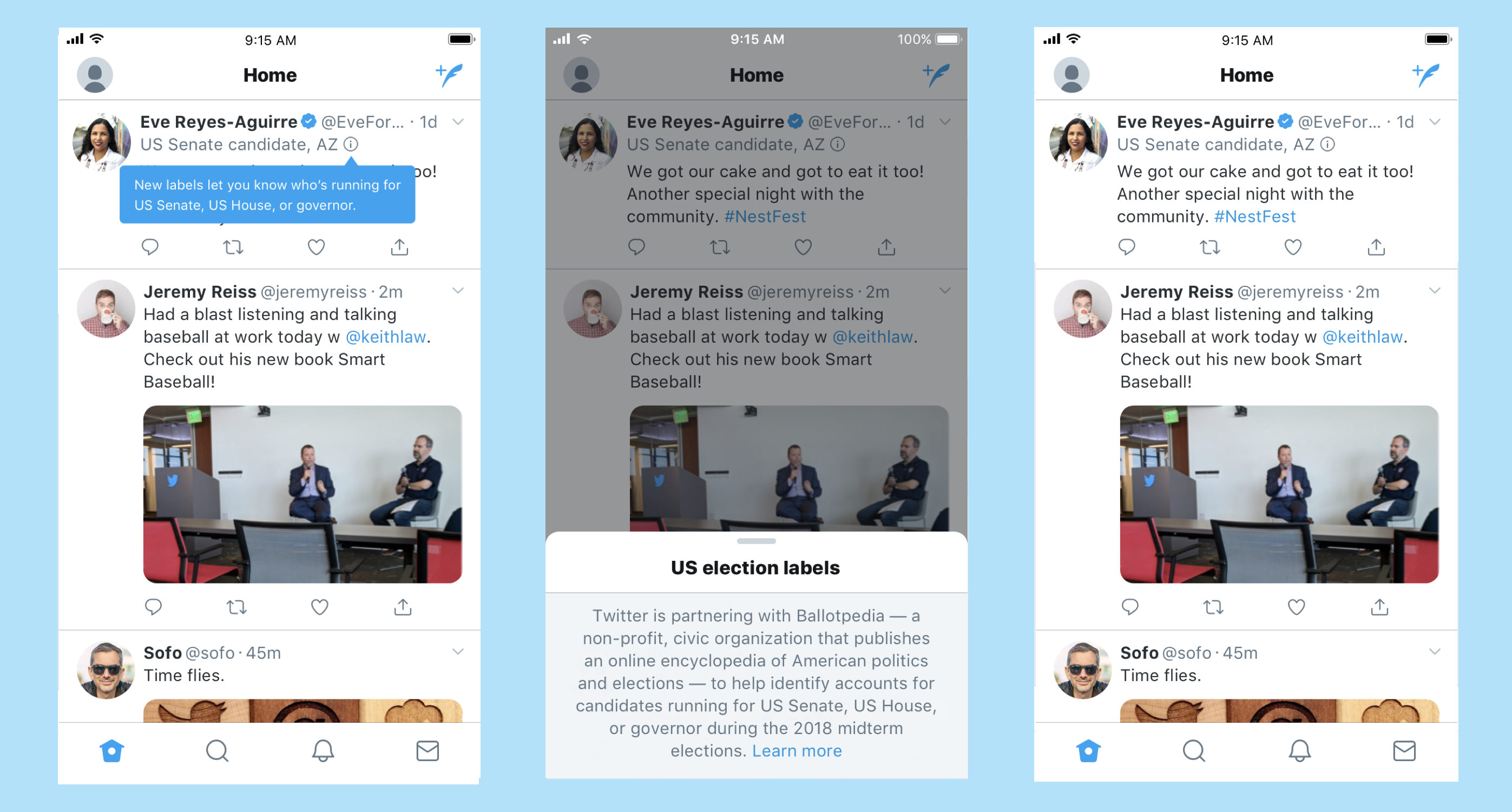The first time a candidate appears on a customerās Home Timeline, they will see a small education tooltip. For further accountability, customers can tap anywhere on the label to see a context half-sheet modal to explain where Twitter is getting information on each candidate.
