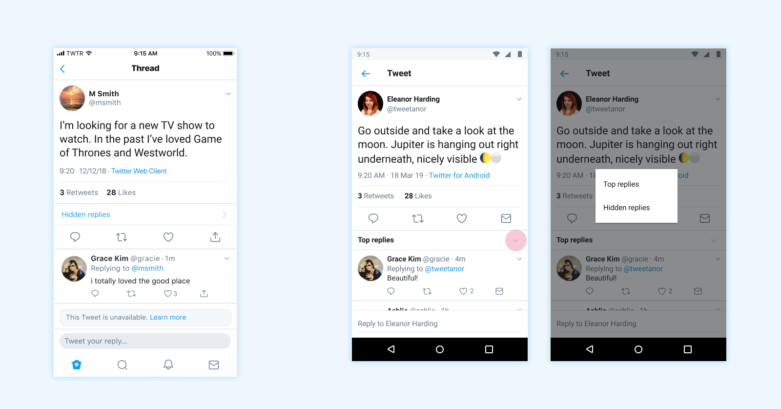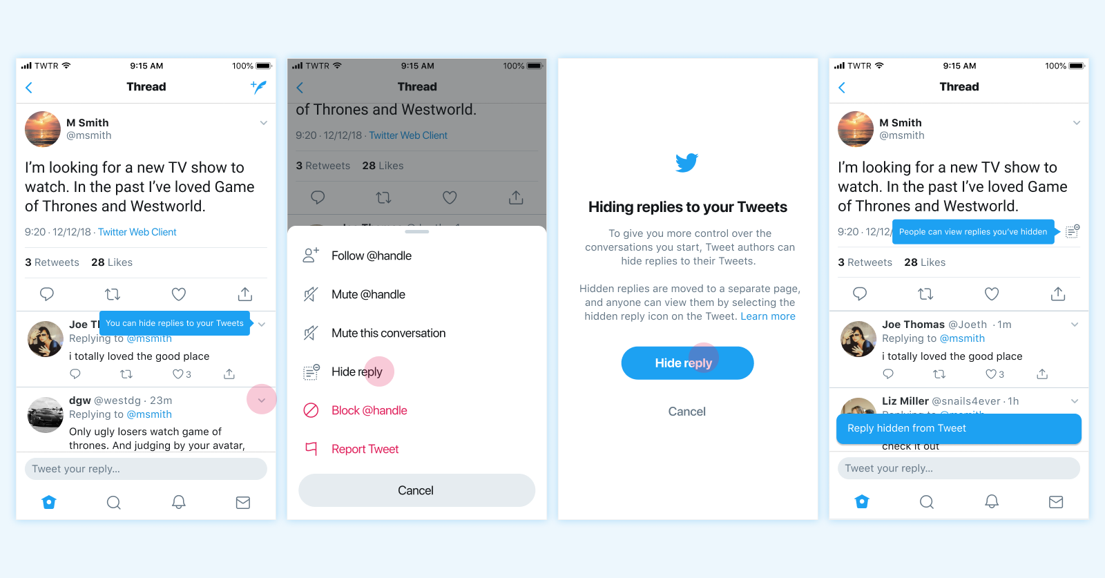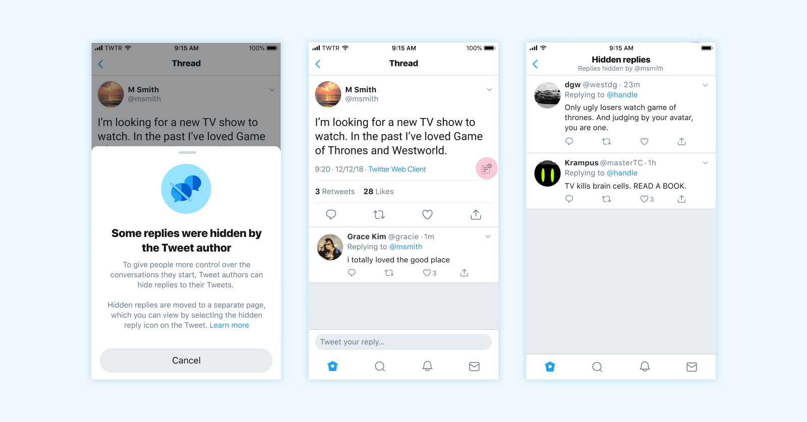 Hidden Replies allows Tweet authors to hide unwanted replies from their conversations.