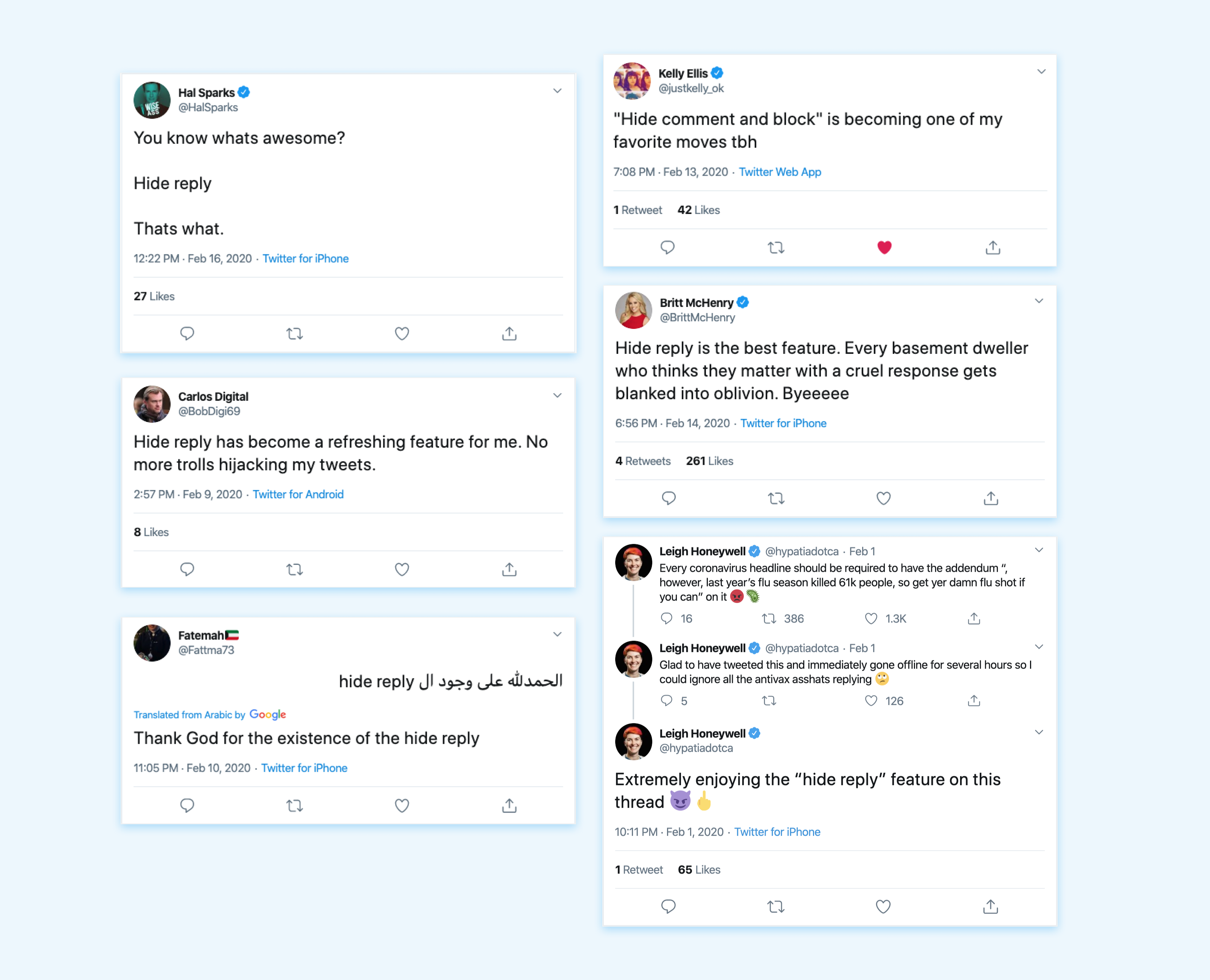 The team had lots of healthy debate over if hidden replies should be shown to the Tweet audience or not. We felt like the average person would want to hide unwanted replies from being seen by everyone. But we were also aware that people with large followings could possibly use Hidden Replies to create and/or spread misinformation by creating a narrative with the replies they had hidden. In the end, we made the extremely tough call to show the hidden replies in a separate view, to help protect against misinformation.